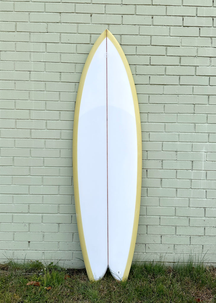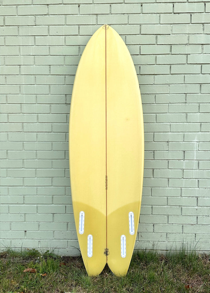 While keeping an emphasis on the speed generating elements that are so inherent in the classic fish concept, this design also incorporates some elements that foster the ability to draw lines more reminiscent to that of a high performance shortboard. Its bottom shape consists of panel V entry with inverted V cut into it, effectively straightening the center entry rocker curve while retaining the advantages of the raised rail line entry for late takeoffs. It then transitions to a full inverted V bottom from rail to rail through the fins, and it eventually evens out to flat off the tail tips.