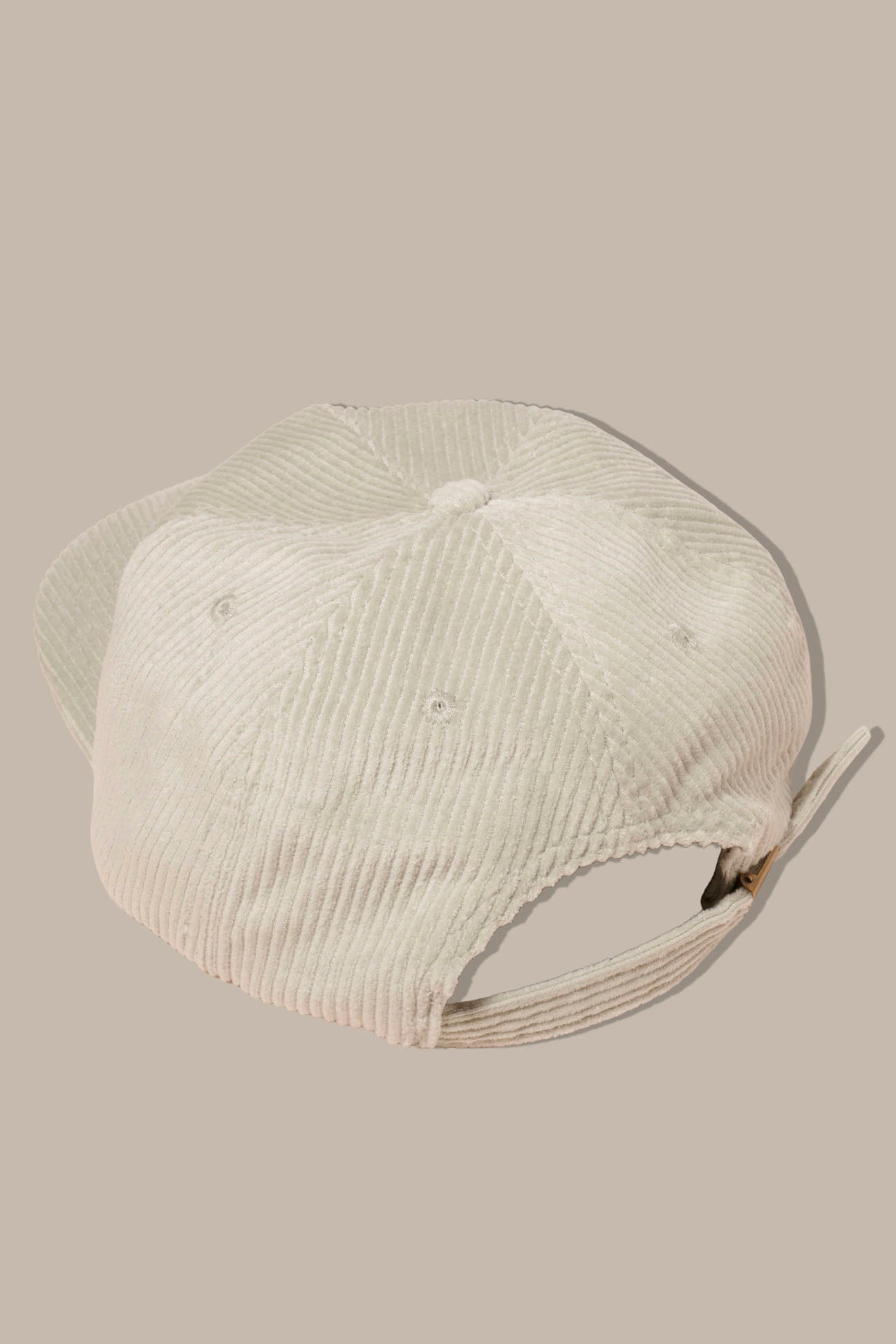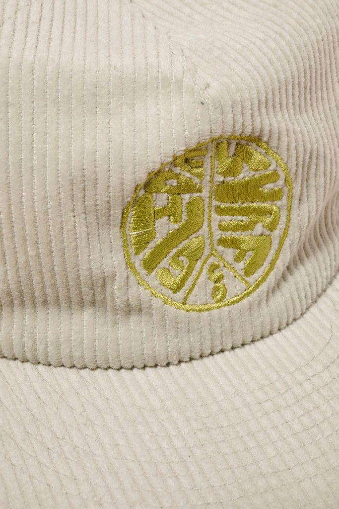 Adjustable corduroy hat with light green embroidered logo. 100% cotton. Peace sign logo by Dusty Nomad.