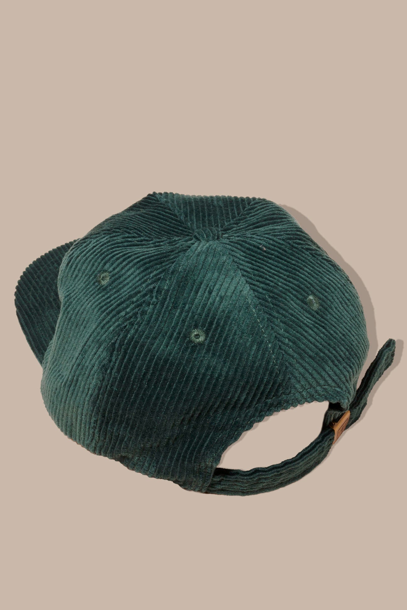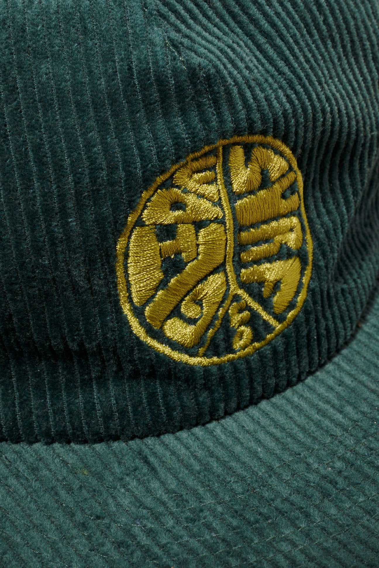 Adjustable corduroy hat with light green embroidered logo. 100% cotton. Peace sign logo by Dusty Nomad.