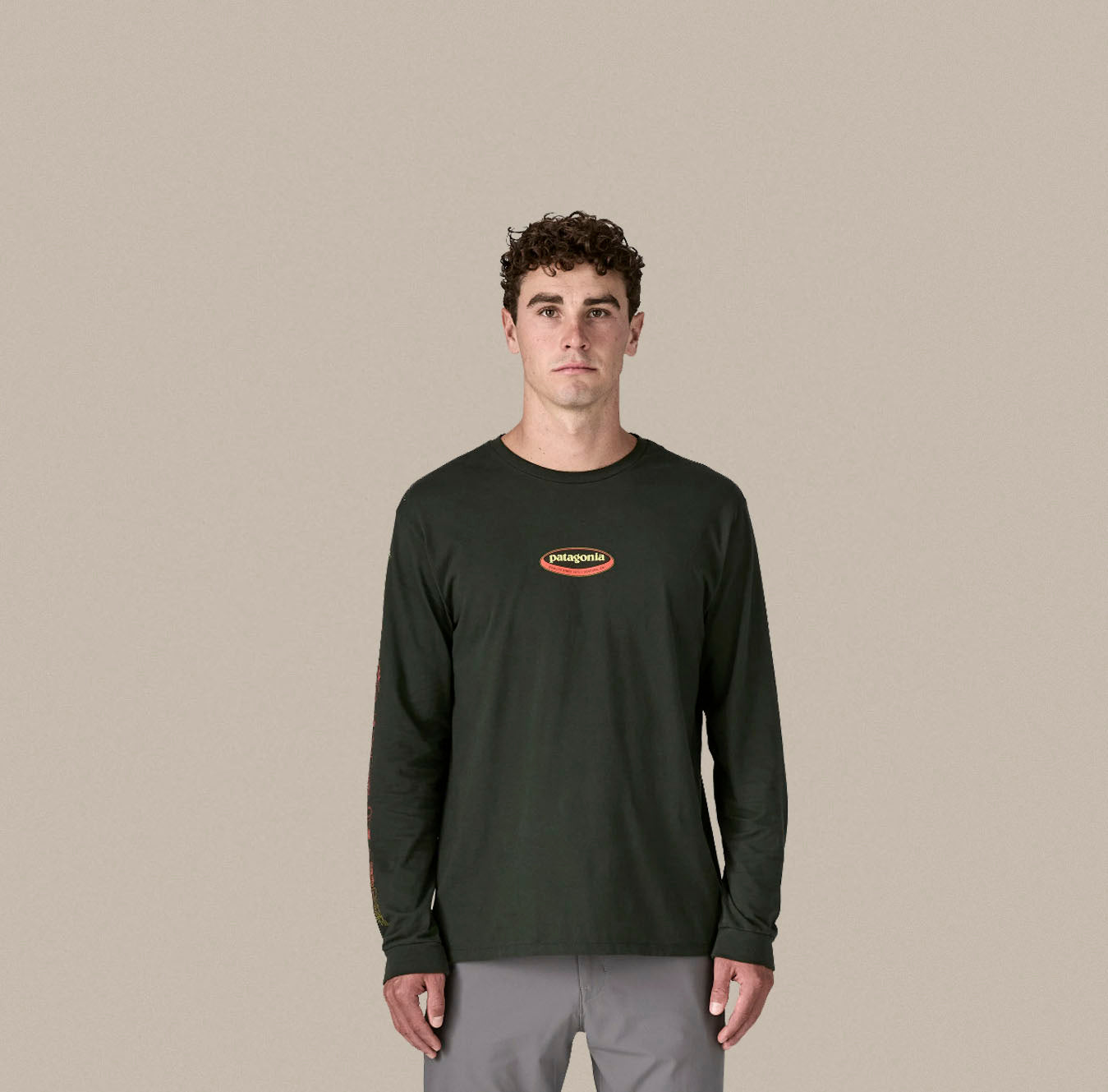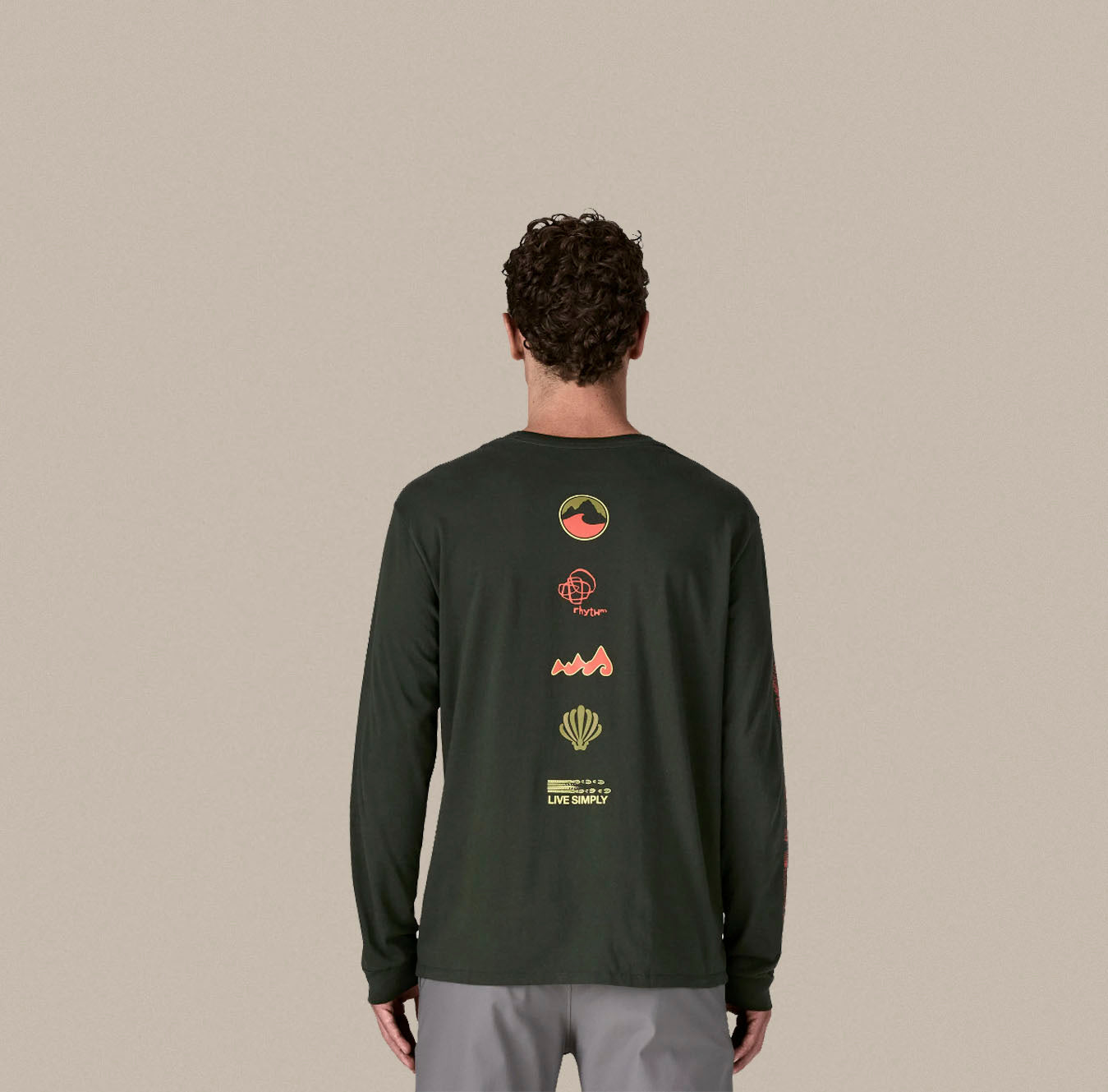 Long Way 'Round artwork takes us back graphically. Look for our circa '95 oval logo; the cult-favorite Rhythm™ design for climbing clothes; an early surfboard graphic; our Water Girl® shell and more. We screen printed the graphic on our Men's Long-Sleeved Long Way 'Round Organic T-Shirt, which is 100% organic cotton jersey and made in a Fair Trade Certified™ factory.