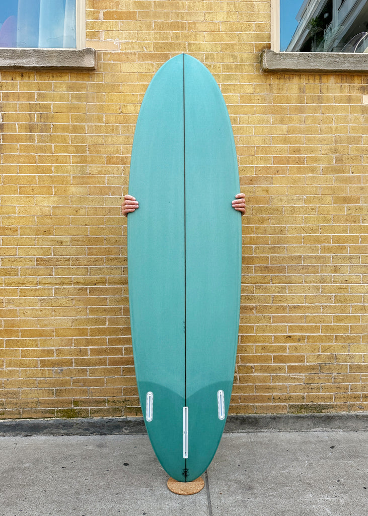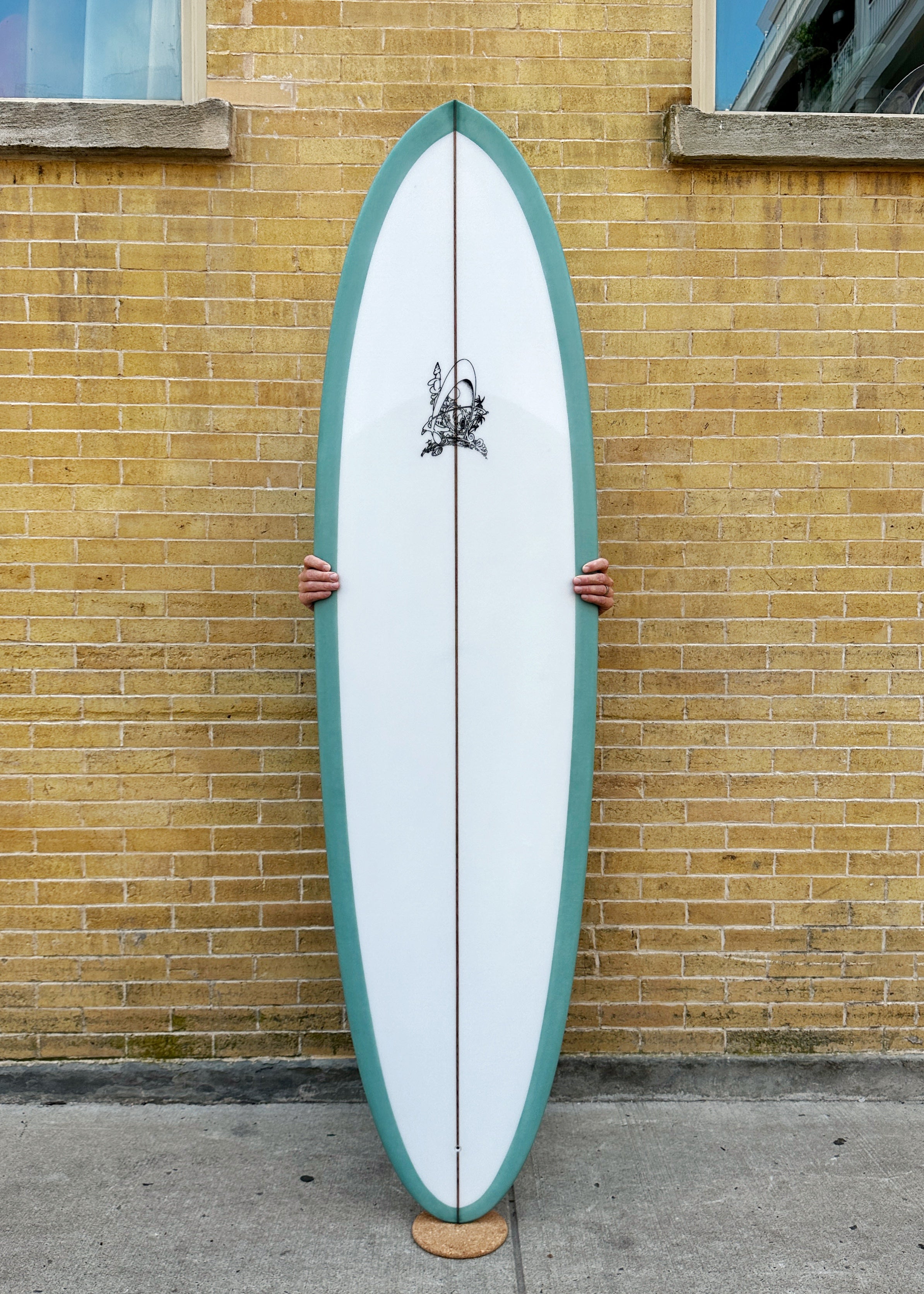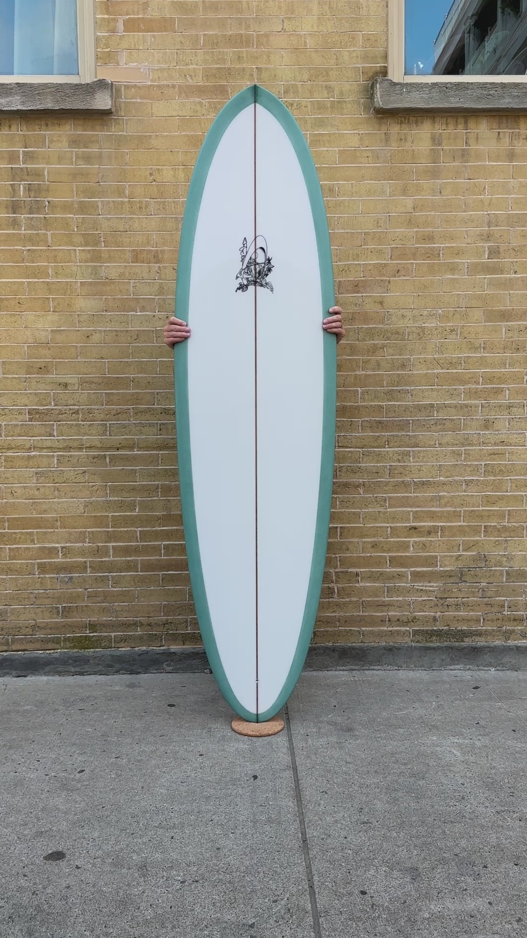 A Contemporary Egg surfboard, available in sizes ranging from 6'8" to 7’11". This sleek board features an optimized proportion and a versatile fin setup, making it ideal for enjoyable surf sessions in a variety of conditions.