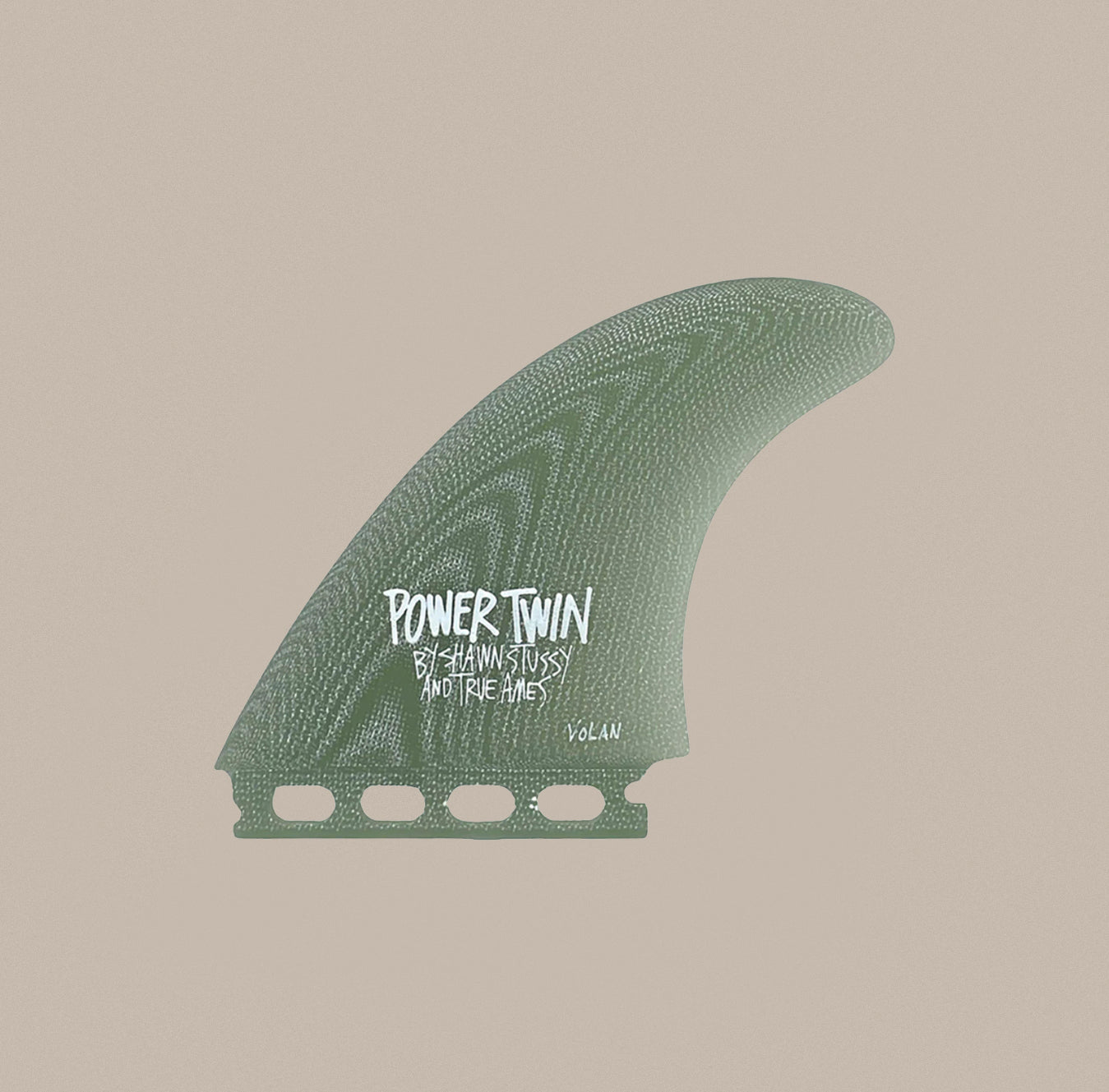 Twin-Fin Set, Futures Compatible, Flat Inside Foil: The Stussy Power Twins are foiled from solid fiberglass and feature a stiff and powerful flex which has been honed in for... you guessed it... maximum POWER! This well-balanced template is the perfect complement to any progressive or performance twin fin shape. We're pleased to offer this latest model from Shawn which is the result of years of experience and shaping knowledge.